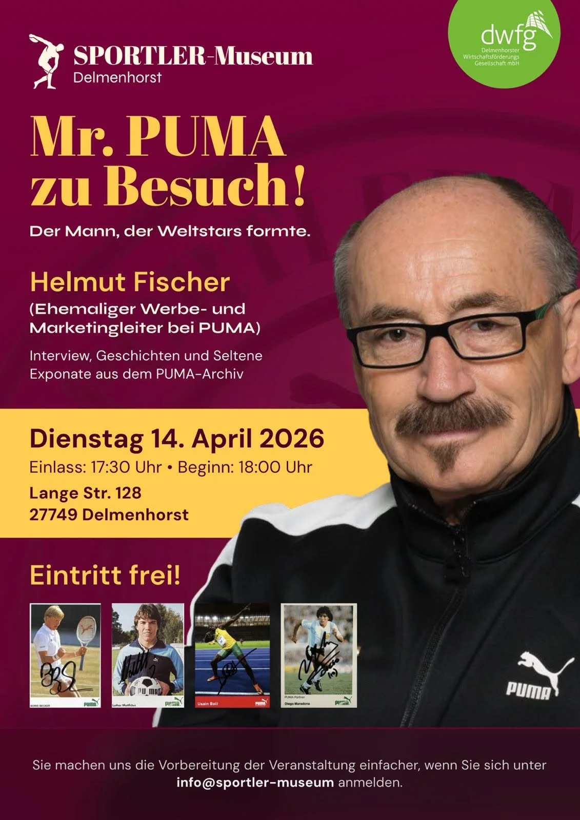 Helmut Fischer ist “Mister PUMA” am 14. April ist er zu Gast im SPORTLER-Museum Delmenhorst.